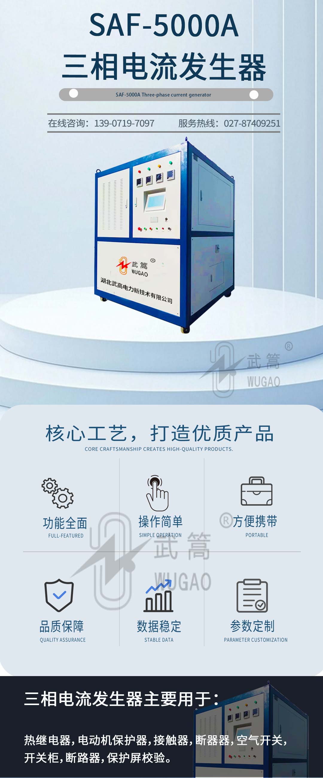 SAF-5000A三相電流發生器(簡稱三相升流器),我公司自行研制開發的測試設備,它集國內外同類產品的優點于一身,采用數控技術,抗干擾能力強,和上一代升流器相比,由于采用低功耗、大容量的自藕調壓器和高導磁率鐵芯制作的變流器,具有輸出功率大,體積小,重量輕等優點。主要用于熱繼電器,電動機保護器,接觸器,斷器器,空氣開關,開關柜,斷路器,保護屏校驗。