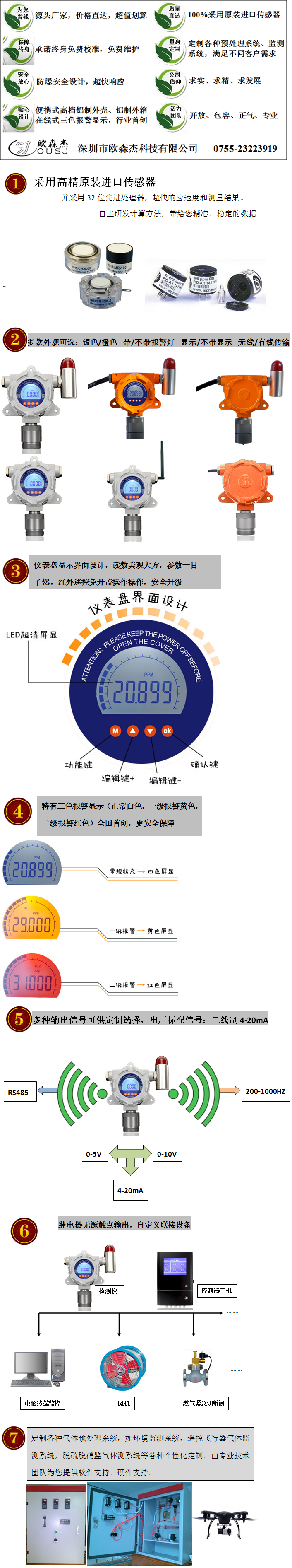 聲光報警、聲音≥75dB@25cm,繼電器輸出信號。背光變色顯示。